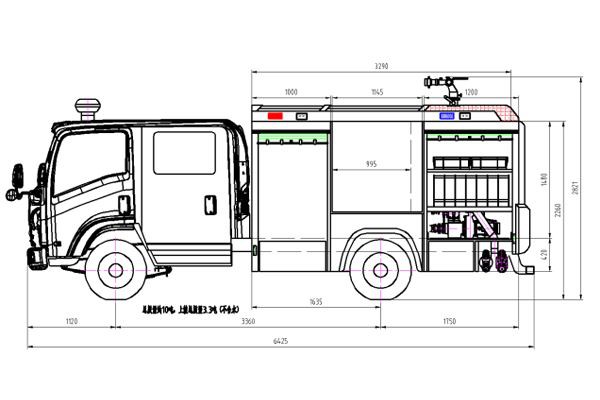 This fire truck adopts the chassis of Qingling Isuzu medium truck. It is equipped with 4HK1-TC51 engine, which is high power direct injection, OHC, intercooled turbo diesel engine. Displacement is 5193cc. Max. output is 141kw. It has strong power, strong vehicle carrying capacity and fast driving speed. Wheelbase is 3360mm (in consideration of the truck is used at city, short wheelbase is recommended due to its small turning radius and strong maneuverability).