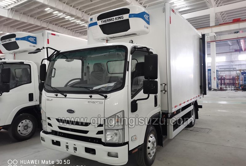 Qingling ISUZU 4-meter micro refrigerator van truck is made with a 4080*2100*2100mm box(Inner dimensions) and Thermo King EV580 Refrigeration Machine. As one of the most professional refrigerator van trucks for meat and fish, it has the lowest temperature until -20℃.The e-motor, for the model EVK100, the CATL LFP, only 1 hours charging, has the power of 106.95kwh, allowing for a driving range up to 260 miles. Additionally, electric vehicles (EVs) are also high perfromance vehicles, whose motors are more than quiet and smooth but require less maintenance than internal combustion engines.