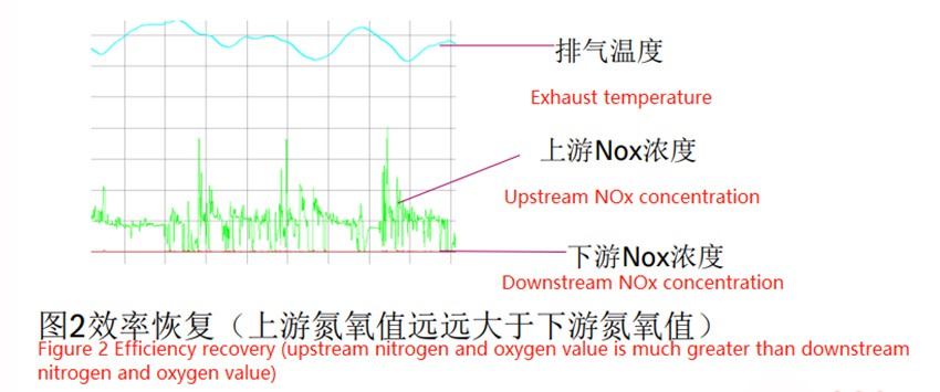 6. Use IDSS particle evaluation to trigger the regeneration; wait for the end of the regeneration to monitor the upstream nitrogen and oxygen value and downstream nitrogen and oxygen value again (about 80km/h and SCR upstream exhaust temperature are around 280°C for about 30 minutes); observe the conversion efficiency during the test (if the discrepancy between those two values is large), the efficiency will be restored as shown in Figure 2; if still no efficiency, replace the SCR carrier.