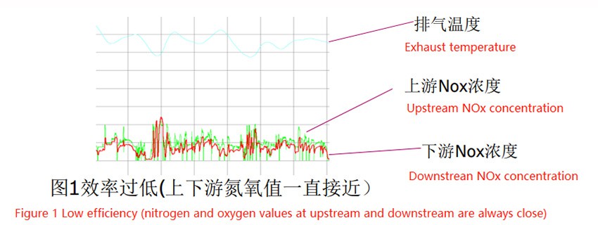 4. Check SCR carrier efficiency; use IDSS when the vehicle is running in a high-speed operating condition (about 80km/h, SCR upstream exhaust temperature at about 280°C), then compare the upstream nitrogen and oxygen value with the downstream nitrogen and oxygen value; observe the conversion efficiency, if the efficiency is low as in Figure 1, the SCR carrier may have HC poisoning or S poisoning;